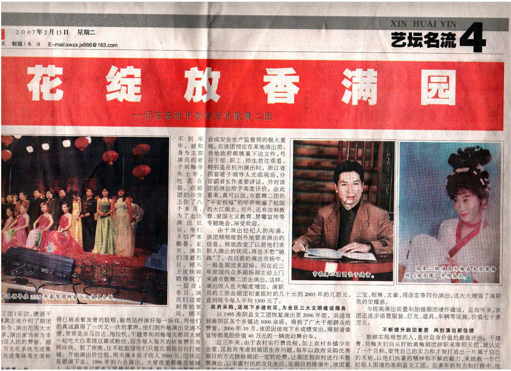 淮安市歌舞二团(原淮阴县文工团)采访,潇洒干练、才华横溢的团长干建青向我们踌躇满志地介绍了剧团从濒临倒闭到蒸蒸日上的艰难历程。如今,演出范围大大拓展,演出收入逐年增长,获奖剧目多多,演出家当渐为丰厚,得到上级有关部门领导的首肯和全区人民的赞誉。剧团还先后获得区委、区政府先进集体、市文化系统先进集团、市委三下乡先进集体、省文化系统先进集体等光荣称号,令人瞩目。